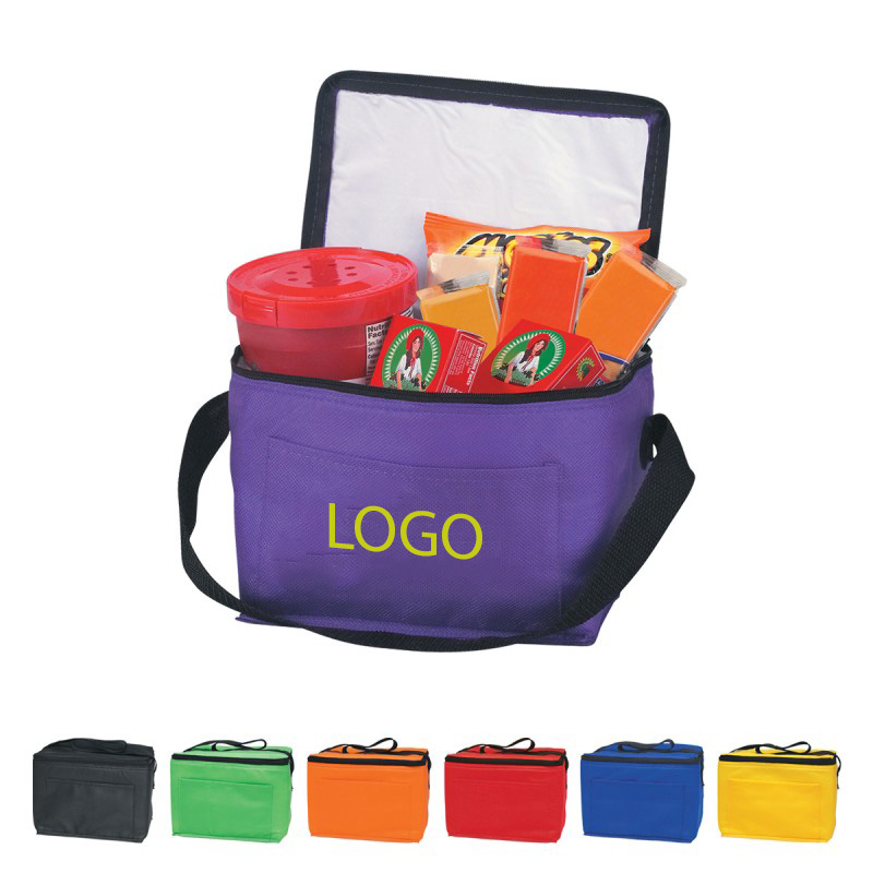 Made of 80 gram, non-woven, coated water resistant polypropylene. Insulated to keep in the cold. Front pocket. Compact, about the size of a six pack. Complies with ANSI, ASTM, CPSIA, FDA, Prop 65. 8" W x 6" H x 5 1/2" D